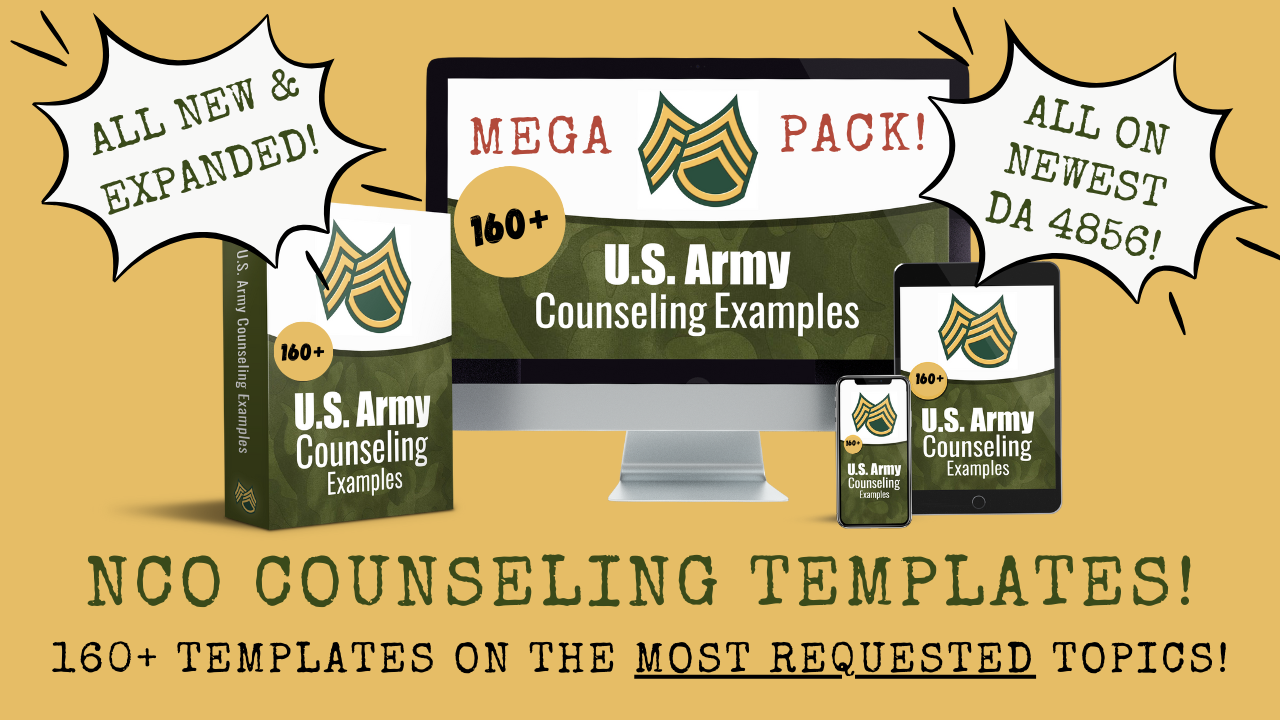 Counseling Soldiers has always been a challenge for new and seasoned NCO's. Our team of expert NCOs have created 162 highly customized counseling templates that you can begin using immediately for all your daily requirements!